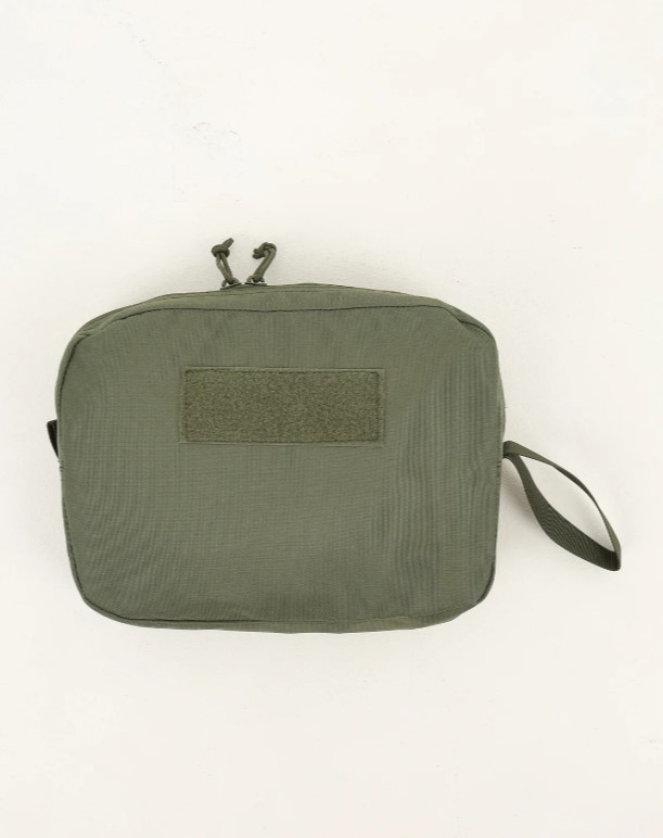 - Передний внешний плоский карман на горизонтальной однозамковой молнии. На кармане расположена липучка-петля для крепления шевронов и именных лент (размер 130×50 мм)