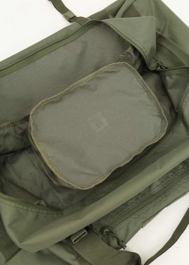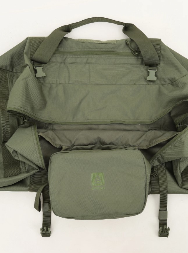 - Баул упаковывается в собственный внутренний карман, закрепленный сверху на изнанке задней стенки. Карман оснащен длинной боковой петлей из стропы для переноски и подвеса. На передней поверхности кармана расположена липучка-петля для крепления шевронов и именных лент (размер 130×50 мм)
