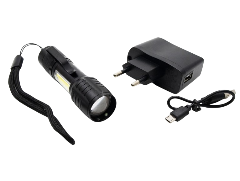 Металлическая клипса на корпусе фонаря пригодится для подвешивания на рюкзак, сумку или одежду. В комплекте удобный темляк на руку. Питание осуществляется за счет Li-ion аккумулятора тип 14500, заряжаемого внутри корпуса фонаря от сети 220 В. Время зарядки аккумулятора составляет примерно 2 часа. Время свечения основного светодиода в рефлекторе – не менее 1 часа.