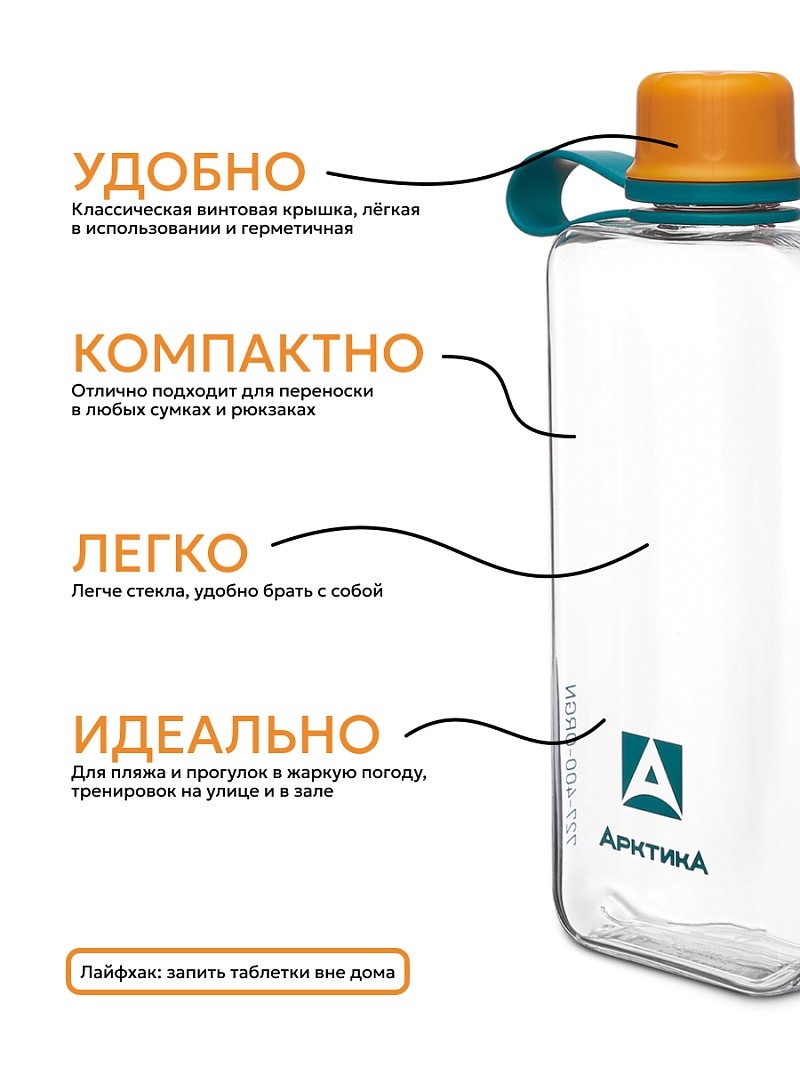 Tritan™ — современная альтернатива обычному пластику и стеклу, который сочетает в себе лучшие их качества. Корпус у бутылки прочный, износостойкий и легкий, как пластик, но прозрачный и безопасный для здоровья, как стекло. Еще она «переживет» падение с высоты человеческого роста, не боится кипятка до 90°С и остаётся прозрачной даже после активного использования.