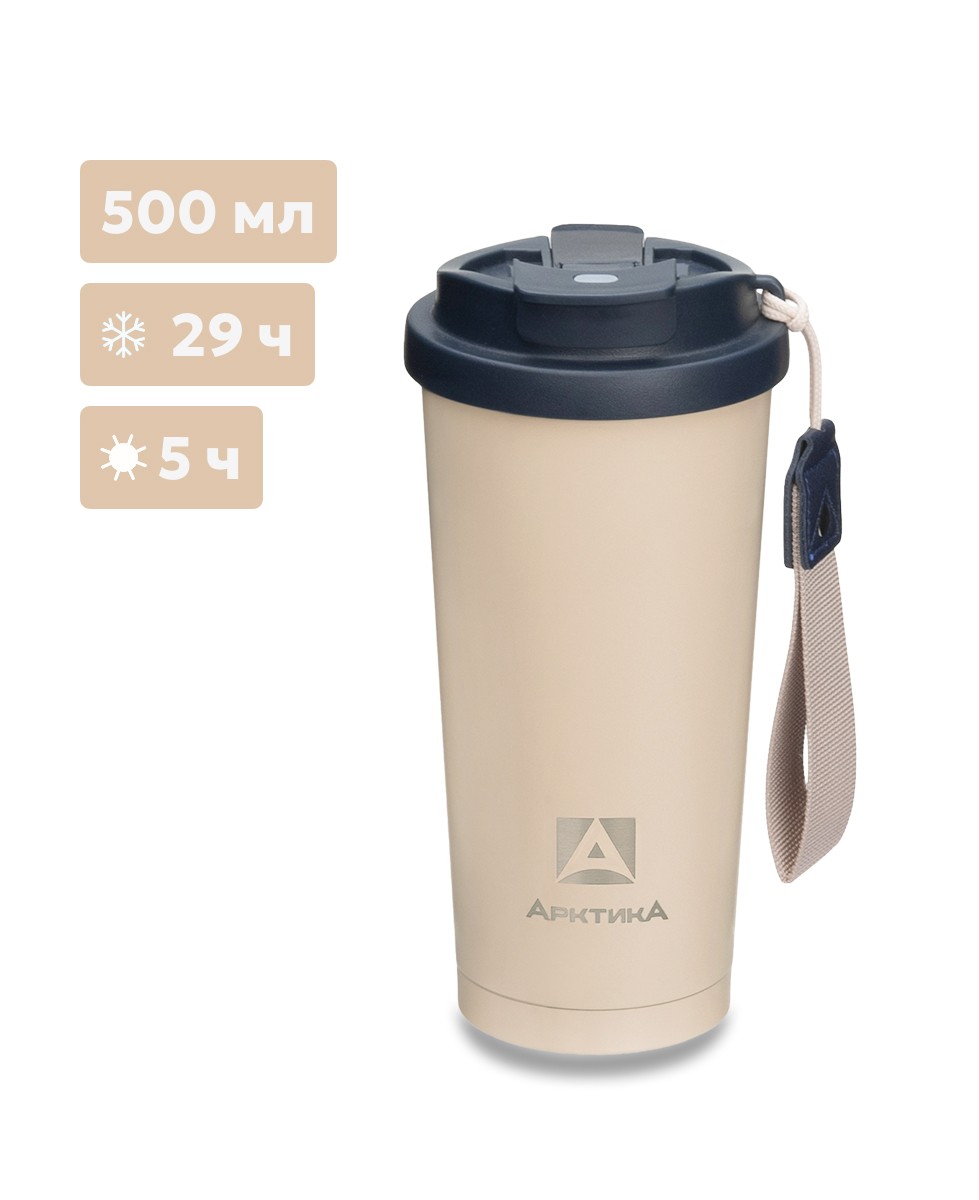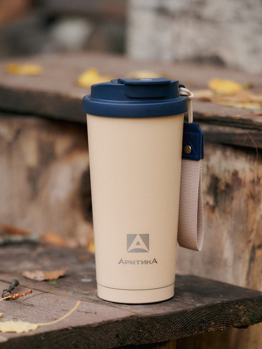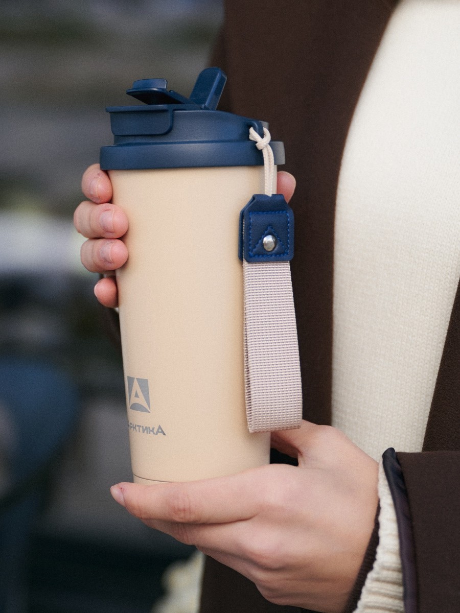 Термокружка объёмом 500 мл отлично подойдёт любителям брать с собой большой кофе, чай или сезонные напитки. Она удобно лежит в руке, обеспечивает дополнительный контроль благодаря небольшому ремешку и легко помещается в стандартные автомобильные подстаканники.